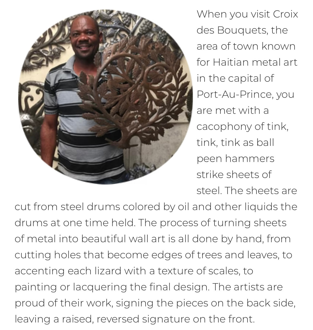 -When you visit Croix des Bouquets, the area of town known for Haitian metal art in the capital of Port-Au-Prince, you are met with a cacophony of tink, tink, tink as ball peen hammers strike sheets of steel. The sheets are cut from steel drums colored by oil and other liquids the drums at one time held. The process of turning sheets of metal into beautiful wall art is all done by hand, from cutting holes that become edges of trees and leaves, to accenting each lizard with a texture of scales, to painting or lacquering the final design. The artists are proud of their work, signing the pieces on the back side, leaving a raised, reversed signature on the front.